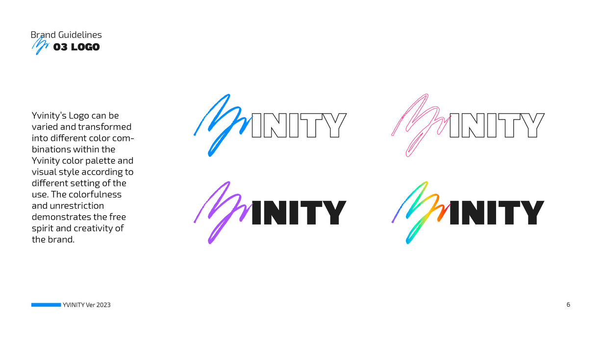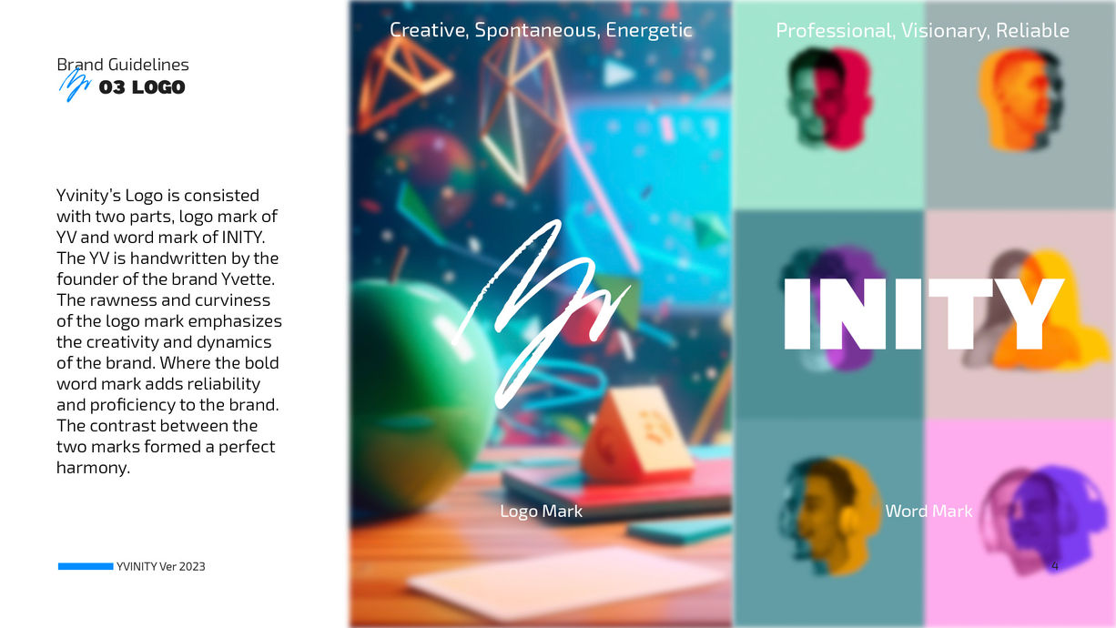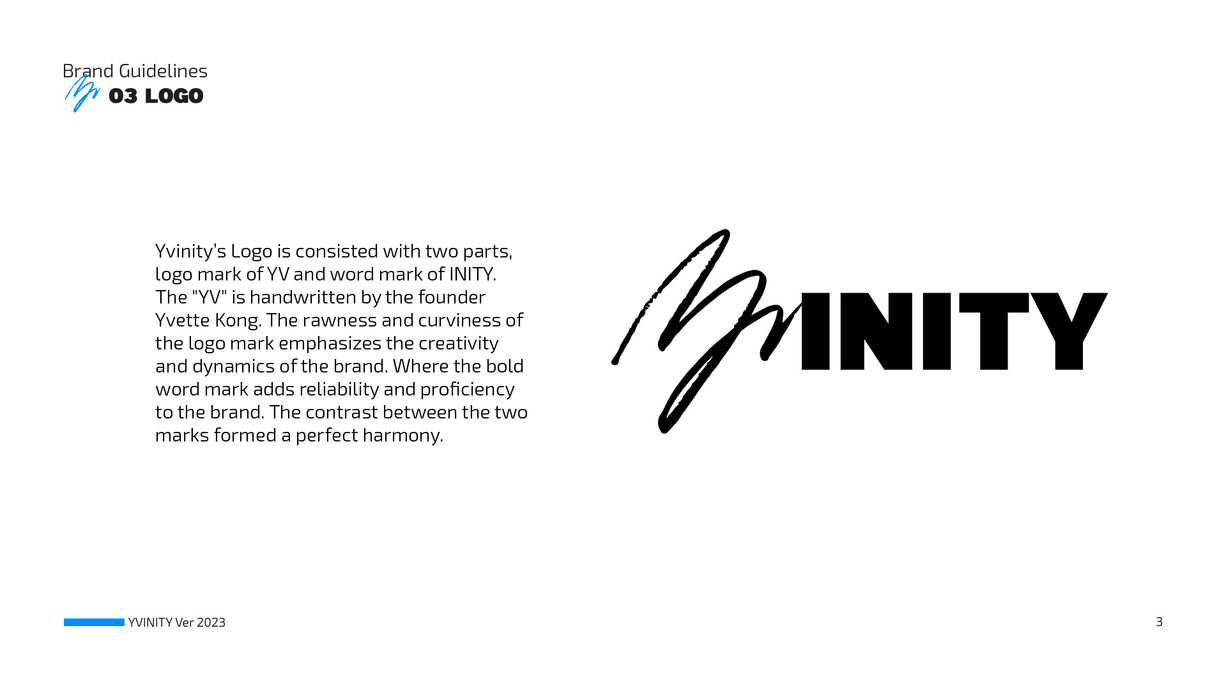 This is a branding project for the start-up company Yvinity. The visual system follows a dynamic modern style, combining traditional 2D graphics with playful 3D models. The rawness and curviness of the logo mark emphasize the creativity and dynamics of the brand. Where the bold word mark adds reliability and proficiency to the brand. The contrast between the two marks formed a perfect harmony. The 3D visual symbol, the curvy "y" can be rotated and reformed as an infinite shape, adding more playfulness and creativity to the company, diverting the brand from ordinary consulting firms. The energetic color palette transitions from problem-solving to future crafting, where all the colors have their unique meaning. The establishment of the concept trademark shows the ambition of the company, as a consulting future star, Yvinity is ready to trademark all traditional brands and build them a brand-new future. Overall, The brandbook consists of logos, visual elements, color palettes, typography, visual direction, and applications. Please click and slide pictures below to view the whole brand guideline.